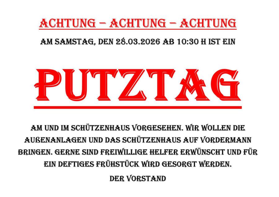 Wir würden uns freuen am Donnerstag und Sonntag alle Schützen und Schützeninnen zum Auf- und Abbau am Schützenhaus begrüßen zu können. Viele Hände, schnelles Ende. Den Dienstplan für das Schützenfest werden wir in der nächsten Woche veröffentlichen.